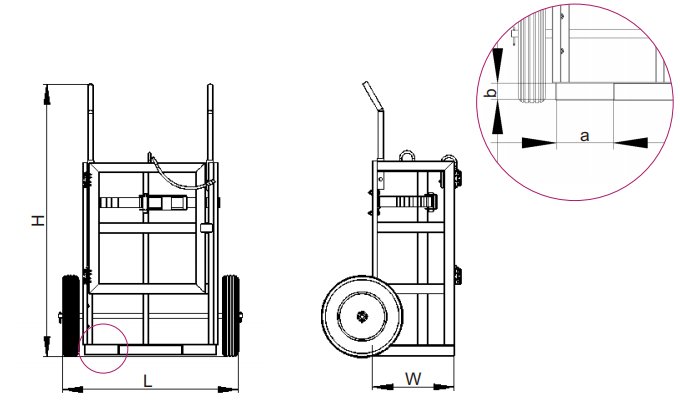 - The cage is supplied with an internal loadbinder to securely fasten both cylinders. Fitted with Handle and dia. 400mm air inflated rubber wheels, this cage can be transported manually or by Crane.